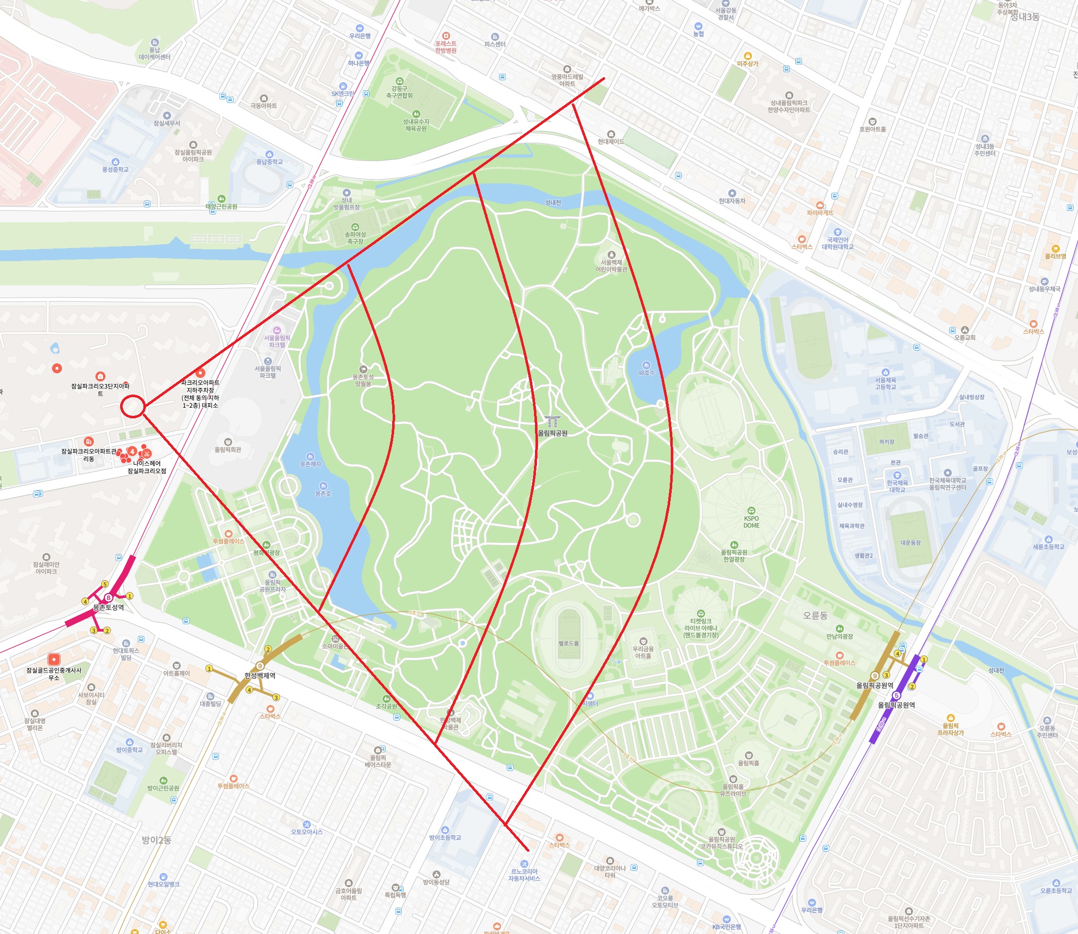 위치를 보시면 올림픽공원 바로 옆에 위치하고 있어 올림픽공원을 앞마당처럼 이용할 수 있는 끝내주는 공원뷰를 자랑합니다.