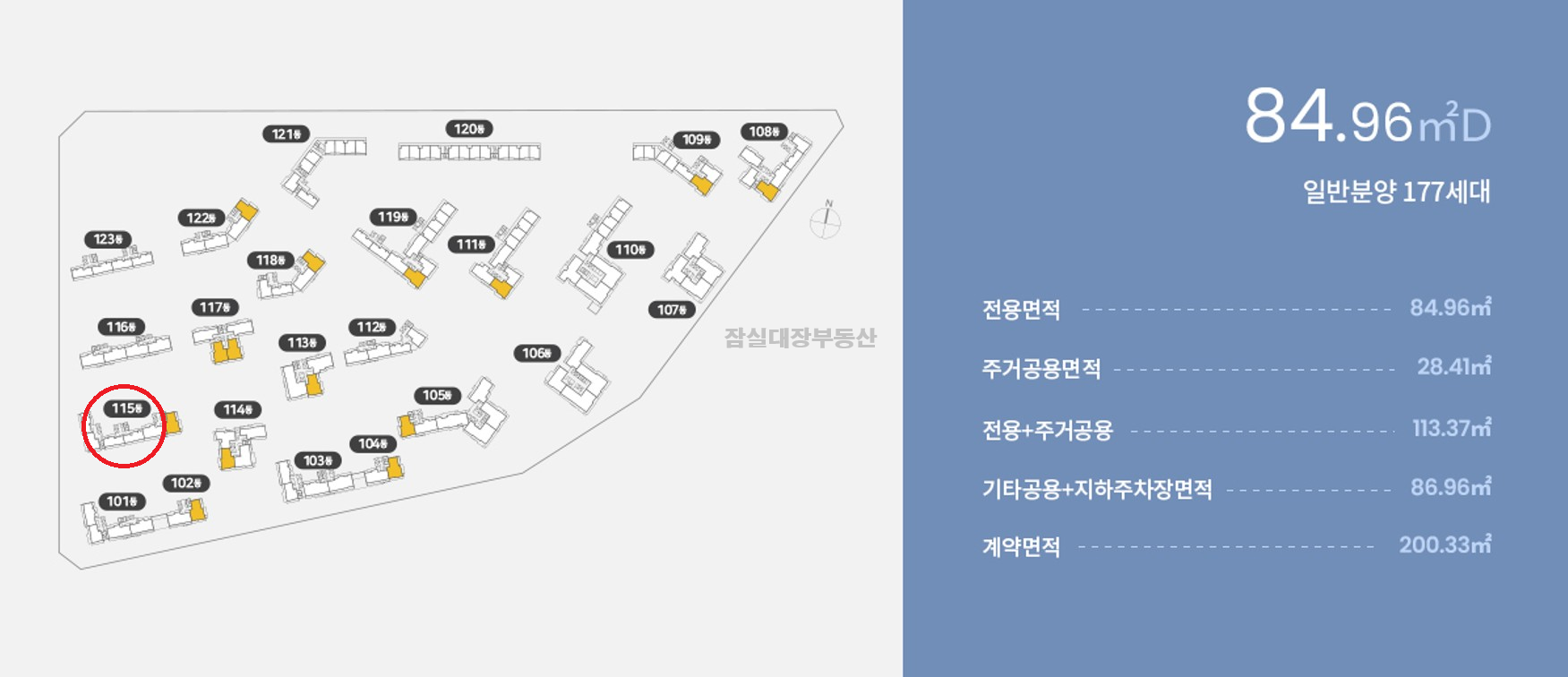 그 외 색이 칠해져 있는 곳들이 84D타입이 배치한 동들인데 그중 115동은 단지의 중간에 위치해서 조용하고 안락한 분위기를 느끼실 수 있는 동이예요.