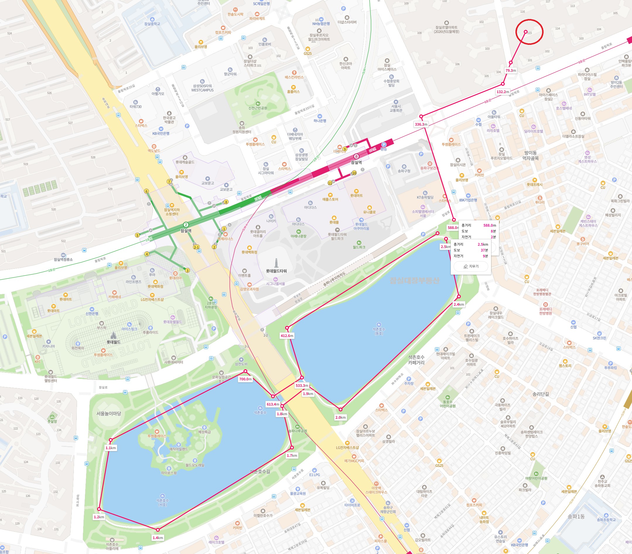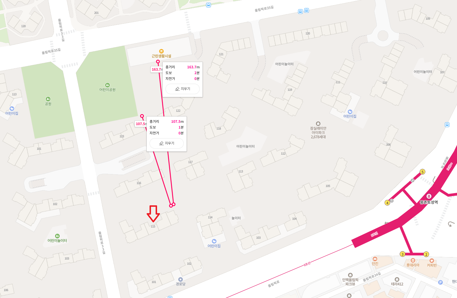 115동에서는 630m만 가면 도착할 수 있고, 이곳에서 석촌호수를 한바뀌 돌면 2.5km 정도로 석촌호수 왕복거리 포함 3.5km정도면 하루 운동양으로는 딱 좋죠~