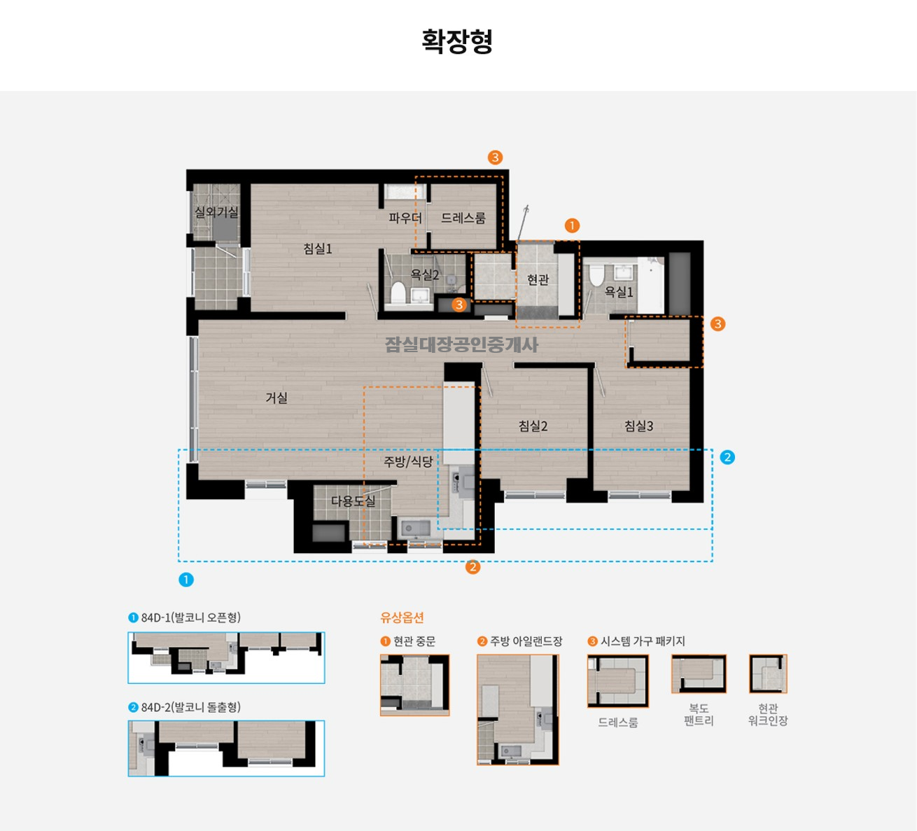 - 방3개 + 욕실2개 활용도 높은 공간 구성