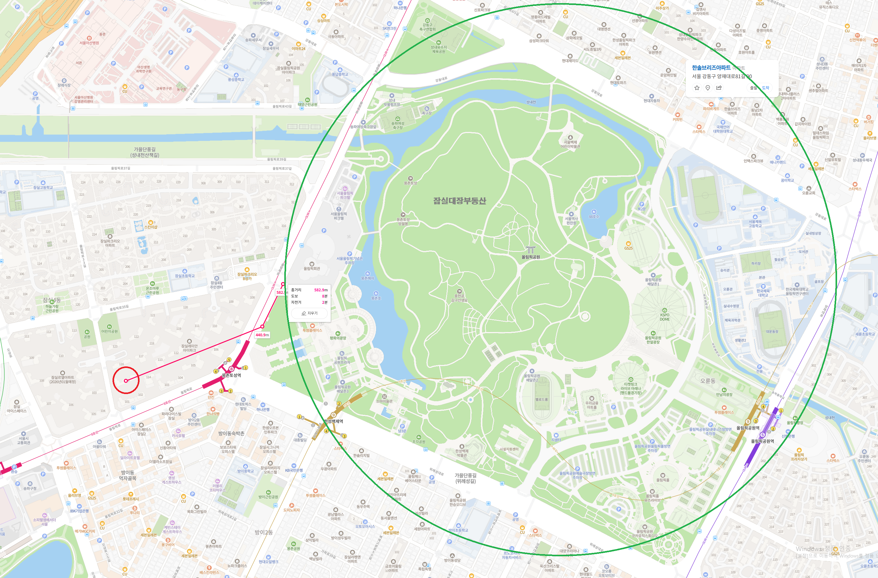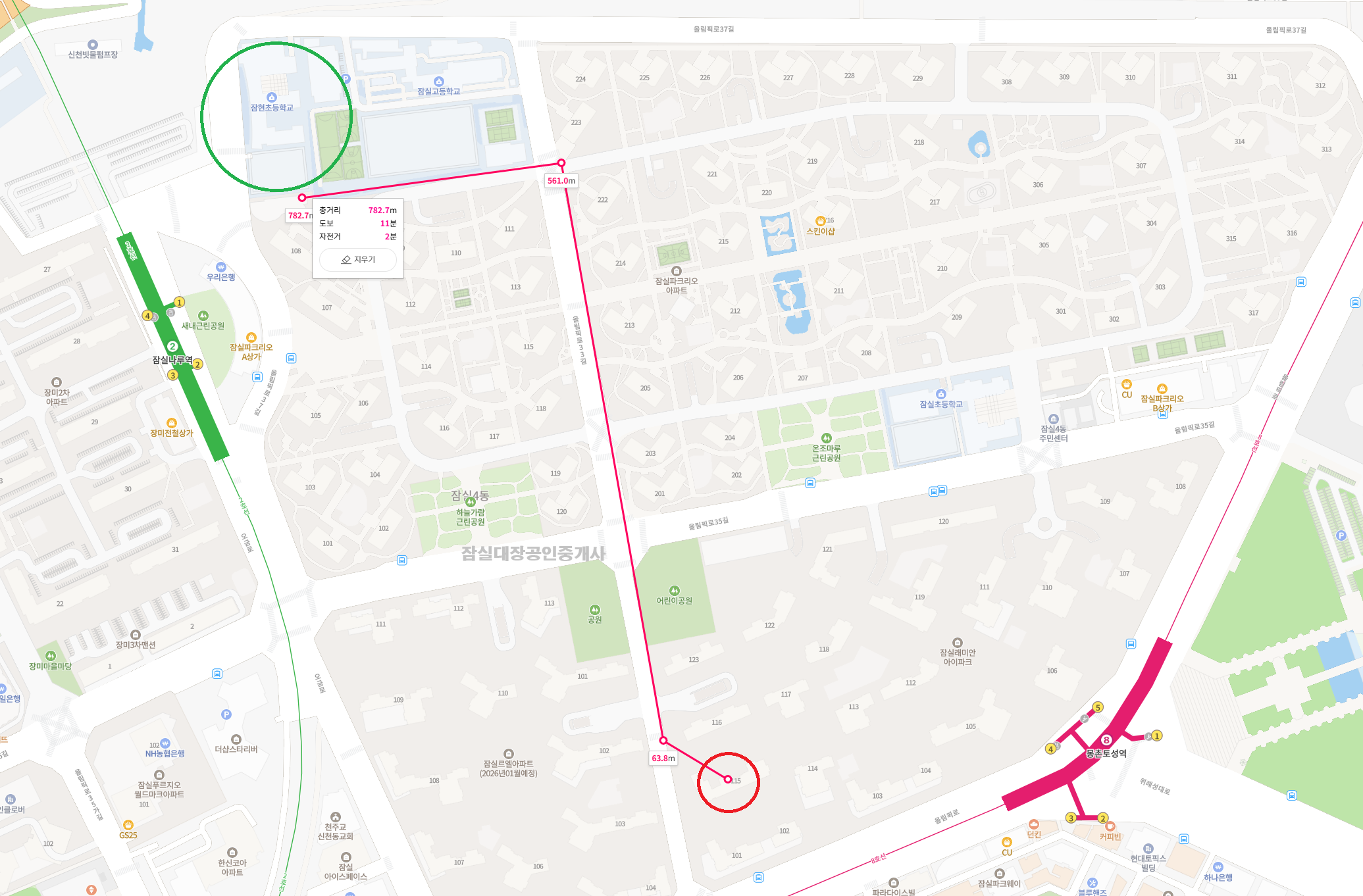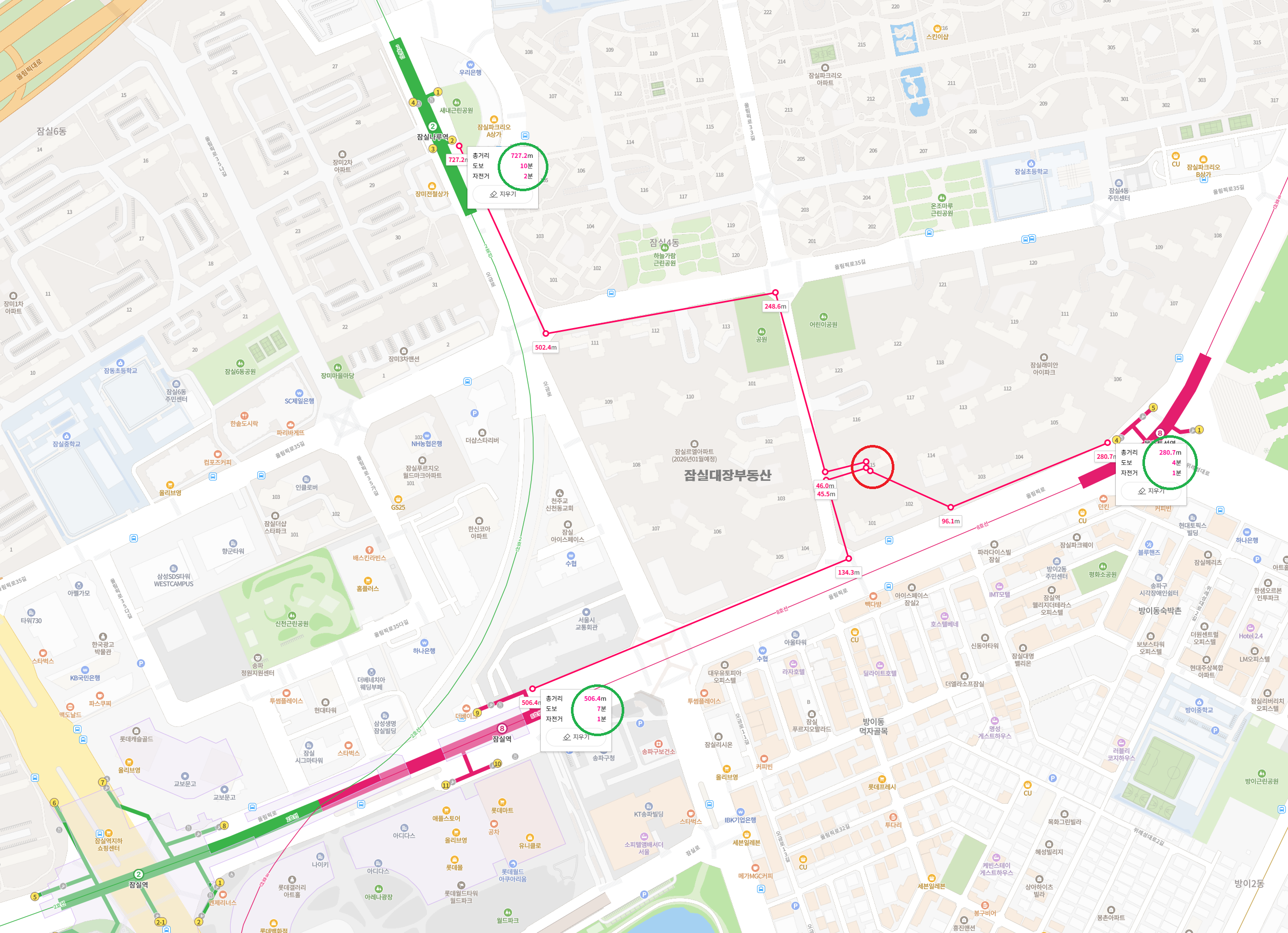 거리로만 보면 몽촌토성역이 5분내 거리로 가장 최적화된 지하철역이 될 수 있겠네요.