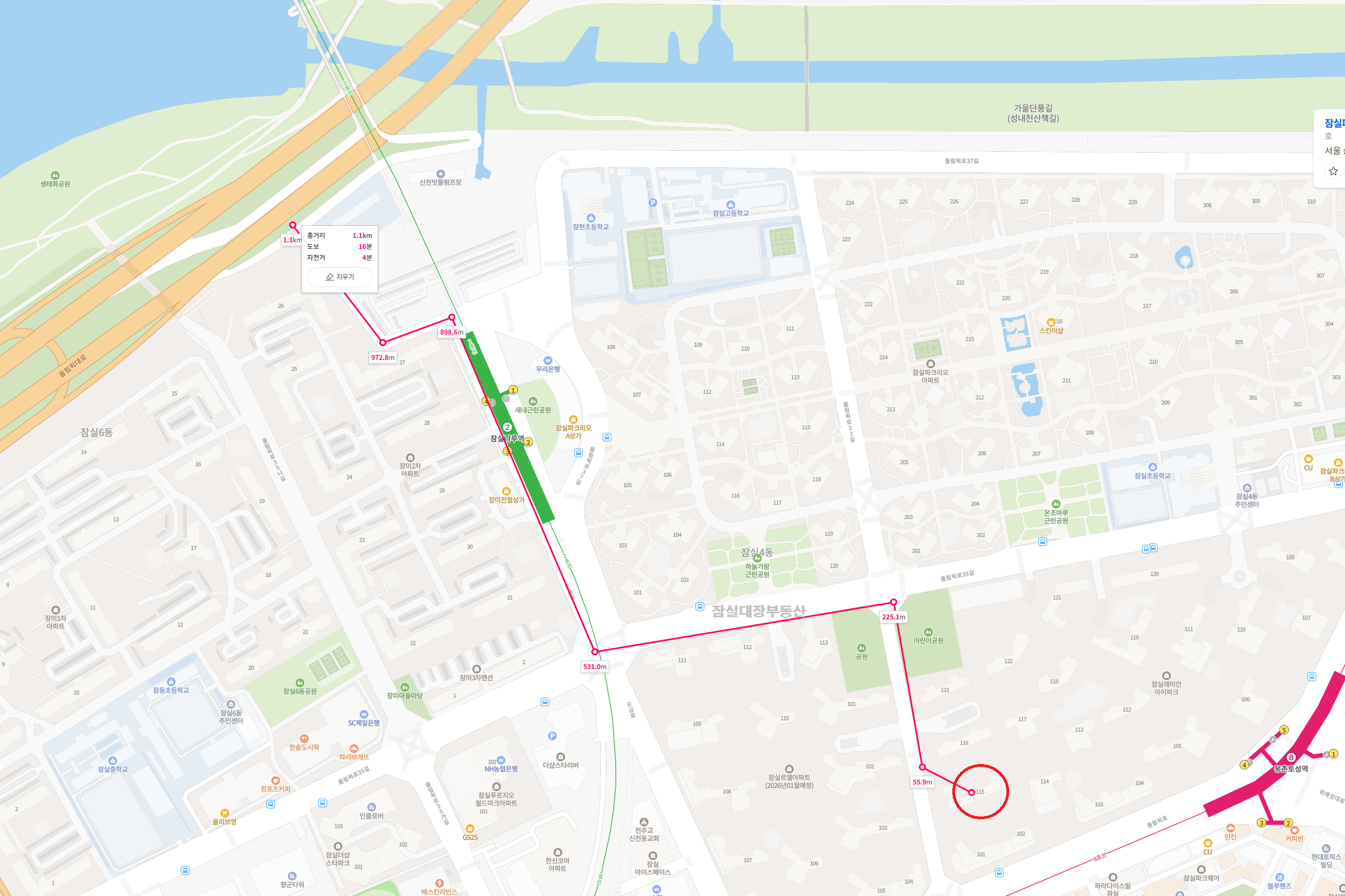 115동에서 한강은 약 1km 만 가면 도착할 수 있는 거리로 잠실나루역을 통한 루트가 가장 빠르고 편합니다.