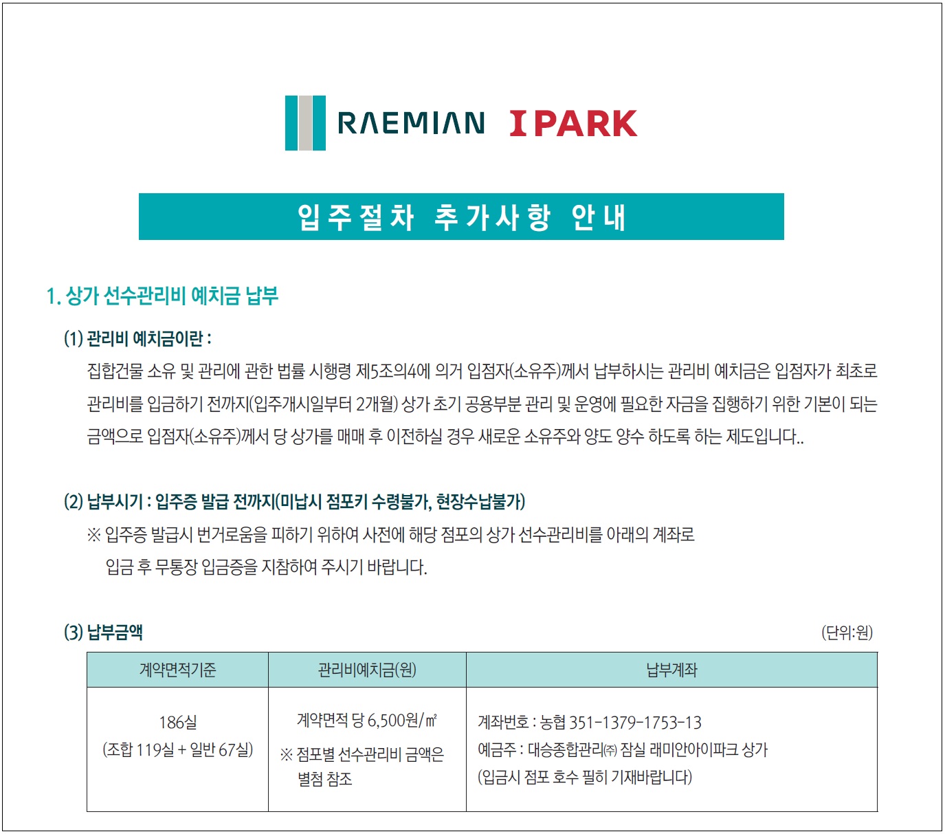 아래 내용은 잠래아 상가 입주절차에 대한 안내문 도착한것으로 올려 드린거예요.
