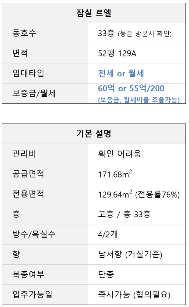 공지잠실르엘 아파트 101동 30평형 월세 매물 정보 2026. 1. 15. · 조회 112