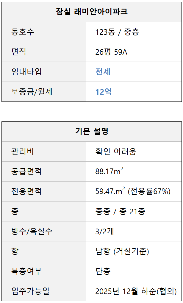 잠실르엘 110동 34평 84C 월세 10억300 물건설명 2025. 11. 29.
