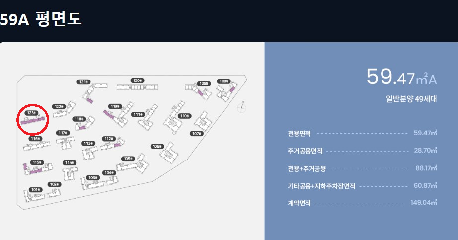 그 외 색이 칠해져 있는 곳들이 59A타입이 배치한 동들인데 그중 123동이 가장 가구수가 많죠.