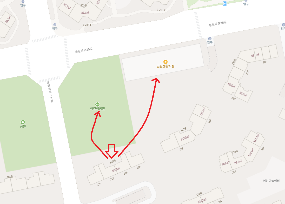 지도를 보시면 아시겠지만 123동 앞에는 아이들이 마음껏 뛰어놀 수 있는 어린이공원이 위치해있고, 가장 생활의 편리함에 도움이 되는 근린생활시설 상가건물도 바로 앞에 위치해있어요