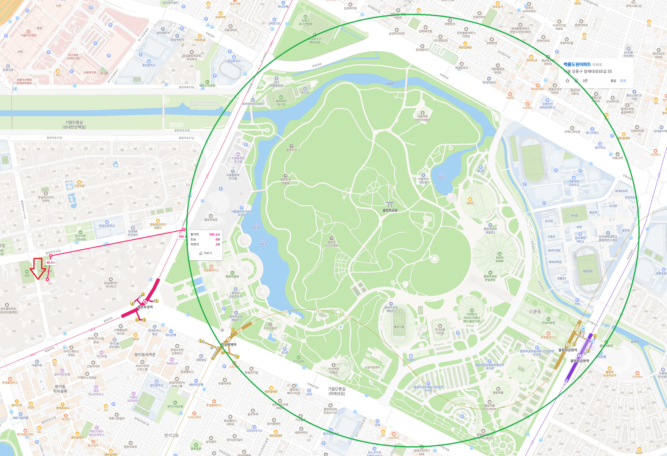 거리로만 보면 몽촌토성역이 5분내 거리로 가장 최적화된 지하철역이 될 수 있겠네요.